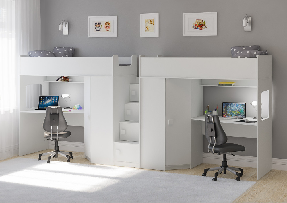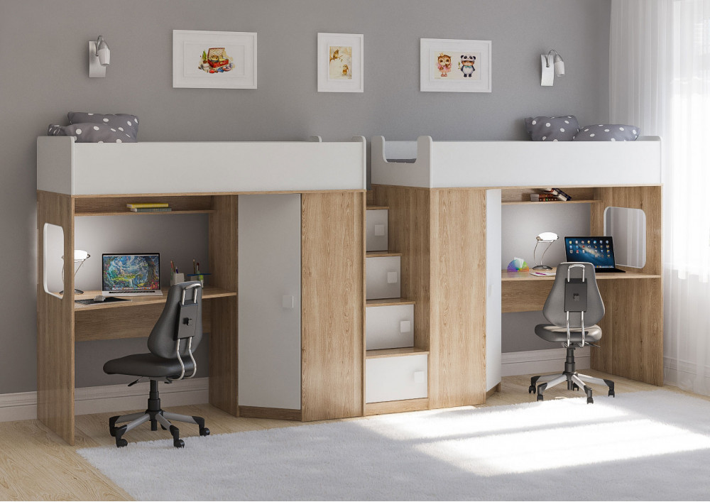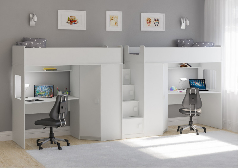 Две кровати, два шкафа, две игровых зоны – одна лестница. Идеальный вариант для двоих детей!